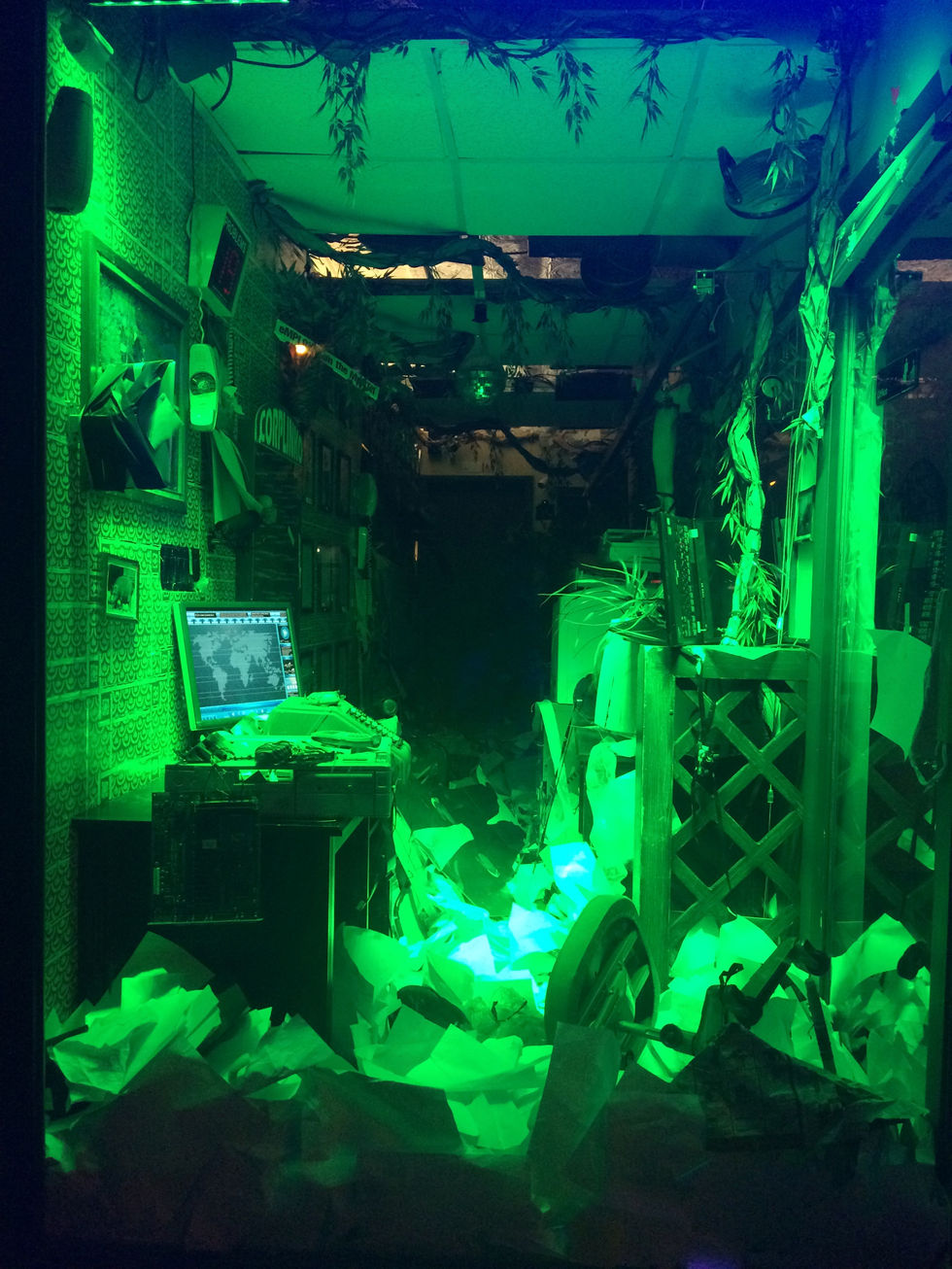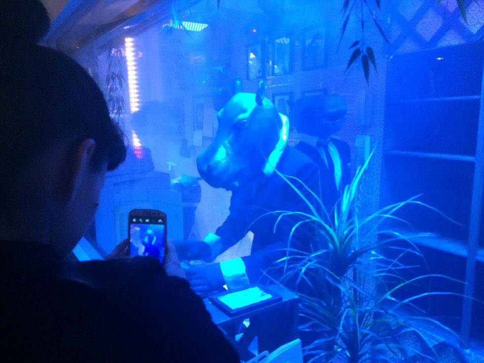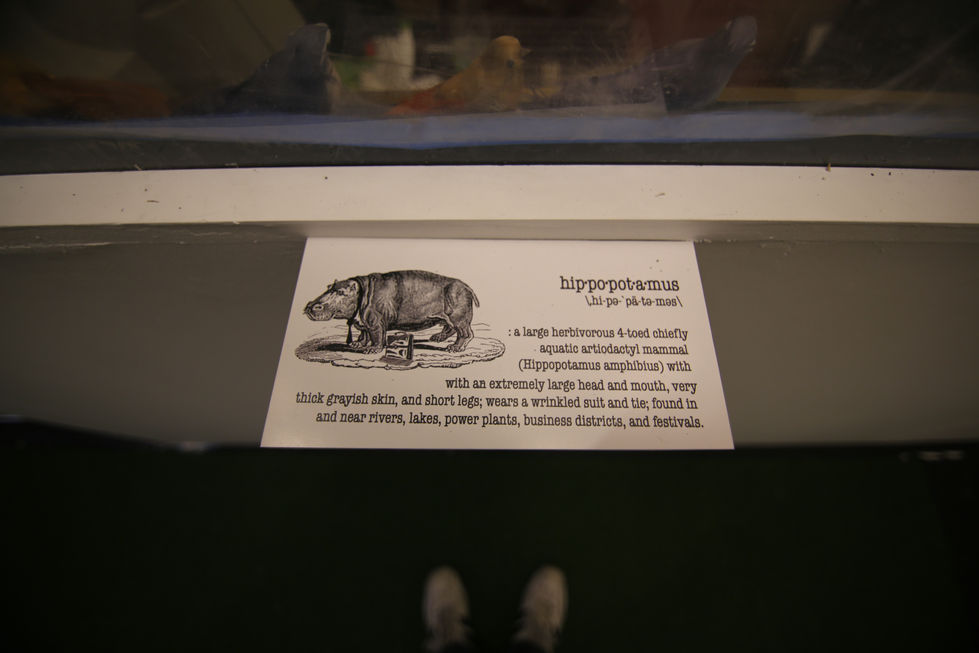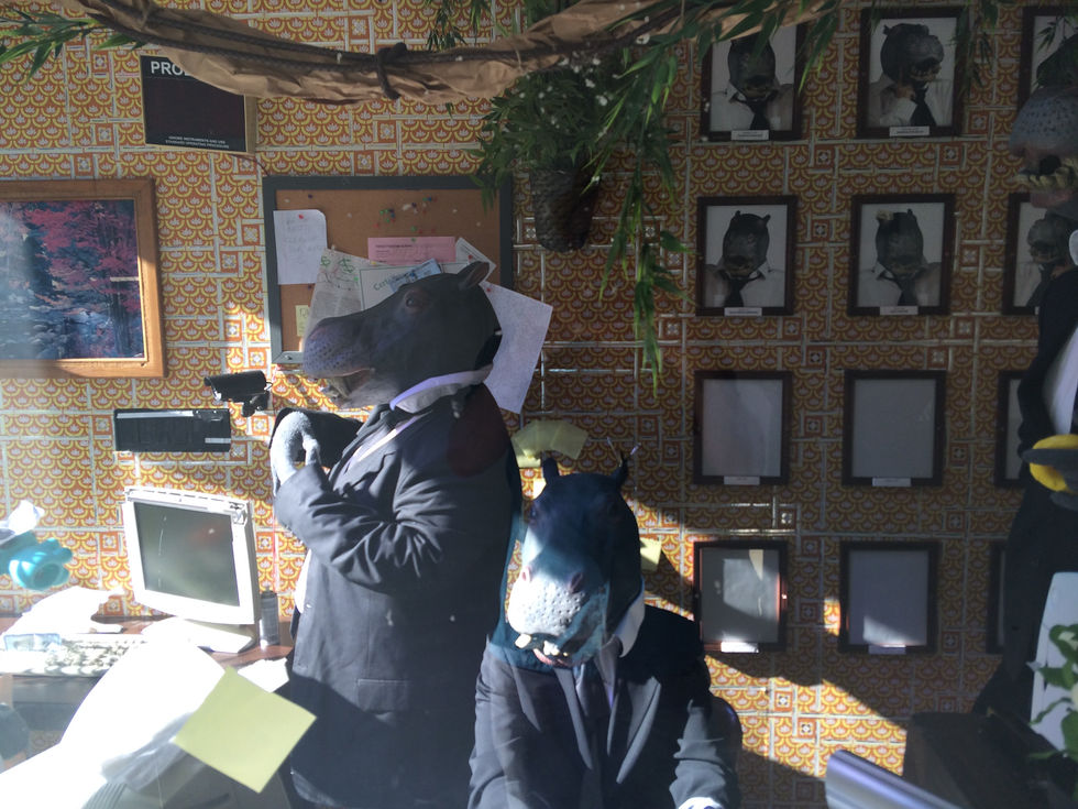In the summer of 2016, Dedo Vabo was commissioned to take over a small art gallery in The Bowery district of Manhattan. They spent 10 days constructing a make-shift office to act as a stage for a nonstop performance that ran 8 hours a day for 21 days straight. The performance space was built in the style of a 1970’s business office with a single glass wall facing the street. This allowed passing spectators to spontaneously stumble across the performance, witnessing the strange scene of an office full of business hippos, first hand. The installation debuted on a Wednesday night at 3AM which was the perfect time to capture few random drunk patrons, with blurry eyes, stumbling home from their local bar.